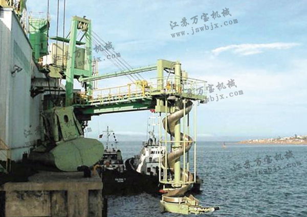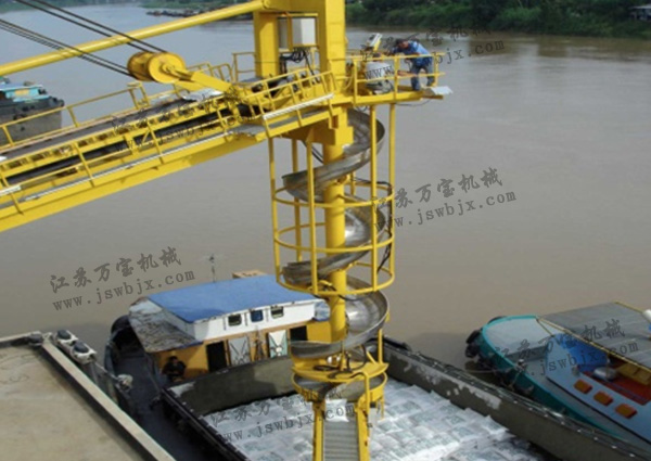 滑槽式裝船機(jī)的裝船能力一般在每小時100噸左右,最大也不超過每小時150噸。過大的速度會易造成袋物在帶式輸送機(jī)上堵塞,嚴(yán)重時會因袋物在過大傾角的螺旋滑槽上強烈下沖造成包裝袋破裂,所以在設(shè)計選型中不要盲目追求裝船能力以免帶來意想不到的不良后果。