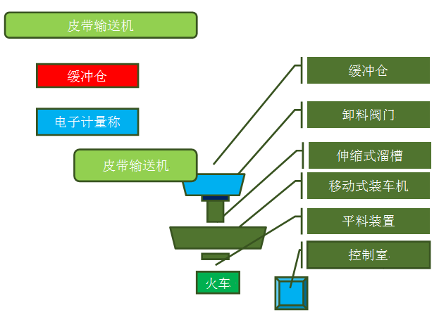 該快速定量裝車系統(tǒng)采用快速計量系統(tǒng)和移動裝車系統(tǒng)相結(jié)合,計量系統(tǒng)采用靜態(tài)計量,精度大于5‰。該系統(tǒng)主要由輸送系統(tǒng)、計量裝車系統(tǒng)(布料機(jī)構(gòu)、緩沖料倉、漏斗型定量倉、稱重系統(tǒng)、鄂式配料閘門、平板閘門)、軌道移動式裝車裝置(平倉系統(tǒng))、控制系統(tǒng)、除塵系統(tǒng)等。 |